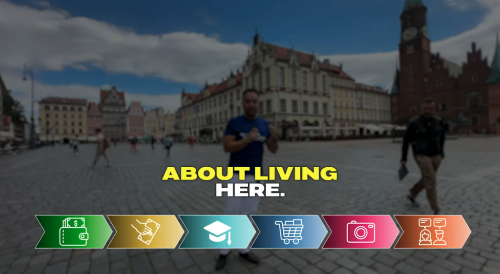 On location in Wrocław’s market square. A color-coded icon progress bar tracks the video’s sections, each segment with its own icon, color, and animated reveal.