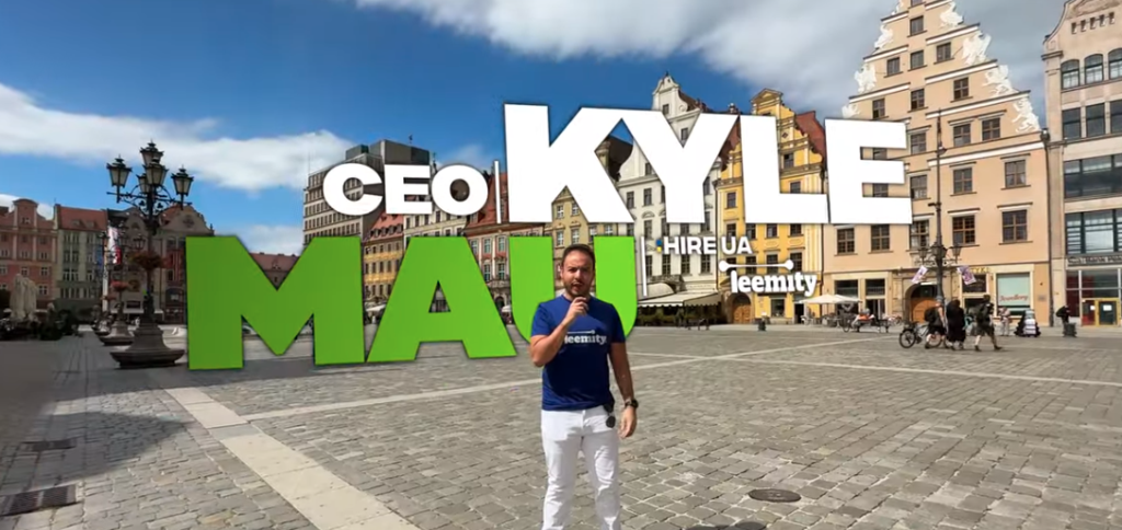 The intro sequence from the same Wrocław video. Massive 3D-extruded text — “KYLE MAU” in white, “CEO | HIRE UA” in smaller block text — composited directly into the real-world background. The green block letters at street level look like they physically exist in the square.