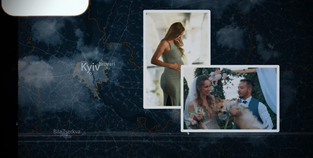 An animated map of Ukraine zooming into Kyiv, with atmospheric cloud and smoke effects layered over the geography. Two personal photos — composited with drop shadows and slight rotation — float on top of the map. This is from “The History of HireUA” — detailing the day I fled with my family from Ukraine.