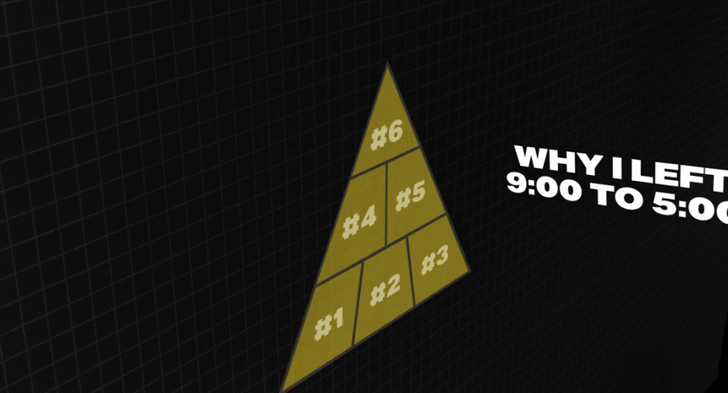 A fully custom 3D pyramid graphic — segmented, numbered, built on a dark grid background — with bold white overlay text introducing the video’s six reasons. This is from the “Why I Left the 9-5” video.