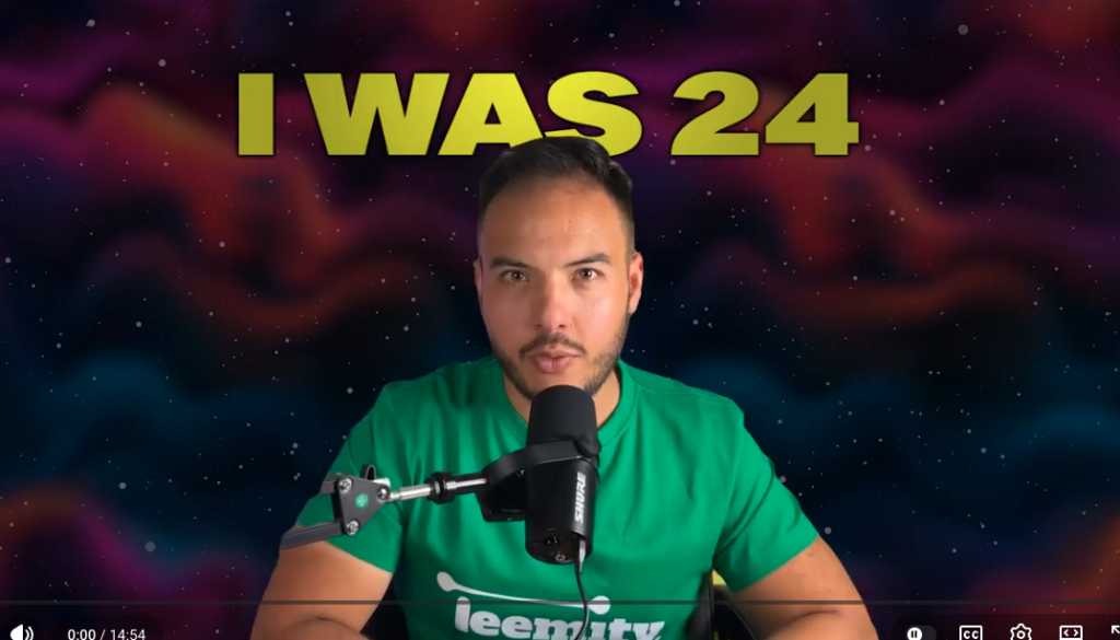 A podcast-format talking head, but the background is not a real room. It’s a designed deep-space environment — purple nebula clouds, stars, atmospheric glow — composited behind the speaker. “I WAS 24” appears in large brand-yellow text across the top.