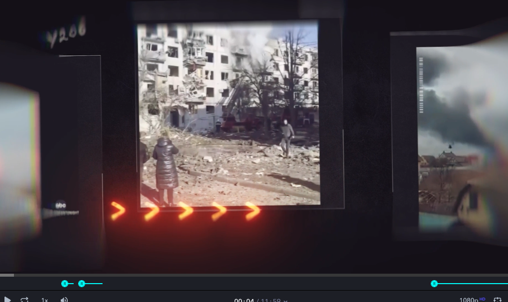 This is from the History of HireUA. Archival footage of destroyed buildings in Ukraine is displayed across multiple 3D-angled screens floating in a dark environment. Animated directional arrows pulse across the bottom. Chromatic aberration and film grain effects give the whole thing a distressed, cinema-quality feel.